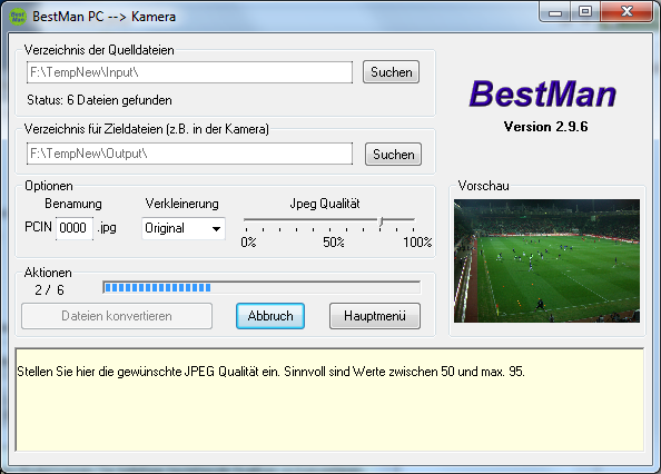 Laden Sie eine beliebige Grafikdatei, die BestMan automatisch auf die für Ihre Kamera notwendige Größe skaliert. Optional fügen Sie einen erklärenden Text hinzu.